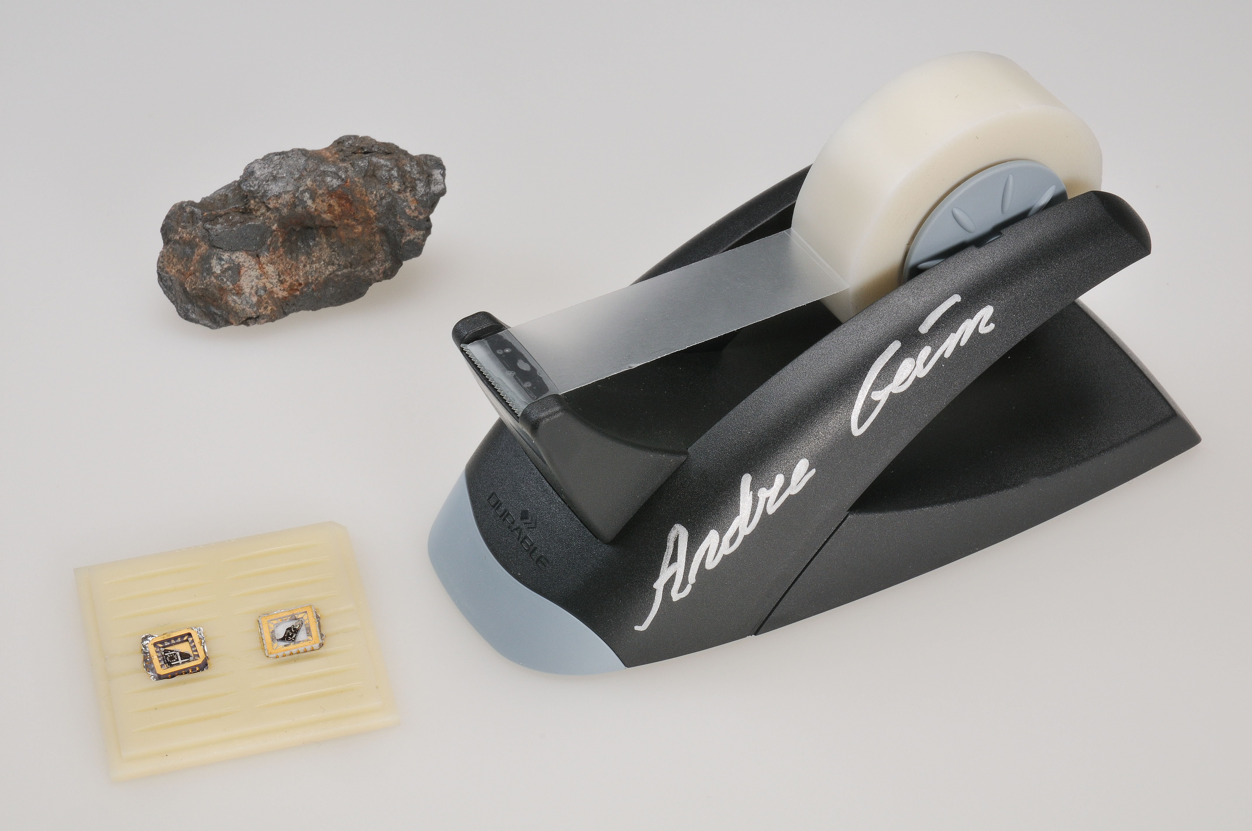 Grafit, tejprulle och grafentransistor Det som händer när man skriver med en blyertspenna är att flagor av materialet grafit fastnar på papperet. En extremt tunn sådan flaga skulle vara ett nät av kolatomer som är endast ett atomskikt tjockt. Länge var detta ett rent teoretiskt material som ansågs omöjligt att framställa i verkligheten. Andre Geim och Konstantin Novoselov prövade dock att med vanlig tejp fånga upp tunna flagor från en bit grafit och det visade sig att vissa av flagorna bara var ett atomlager tjocka. Det nya materialet grafen var verklighet och dess egenskaper kunde kartläggas. Grafen är det tunnaste och samtidigt starkaste materialet som någonsin framställts. Det leder elektricitet bättre än de flesta material. Inom tekniken öppnar grafen möjligheter inom såväl materialteknik som nya elektronik. Det första provet på grafen i en elektronisk komponent visas till höger. Föremålen donerades till Nobelmuseet av Andre Geim och Konstantin Novoselov 2010.Deutsch: Graphit, Klebeband und Graphentransistor: Schreibt man mit einem Bleistift, bleiben Graphitflocken am Papier haften. Eine extrem dünne Flocke besteht aus einem Netz von Kohlenstoffatomen, die nur eine Atomschicht dick ist. Lange Zeit existierte dieses Material nur in der Theorie und man dachte, dass es unmöglich real existieren könne. Andre Geim und Konstantin Novoselov gelang es jedoch, mit gewöhnlichem Klebeband dünne Flocken aufzufangen und zu zeigen, dass einige dieser Flocken nur eine Atomlage dick sind. Das neue Material Graphen war Wirklichkeit und dessen Eigenschaften konnten untersucht werden. Graphen ist das dünnste und gleichzeitig stärkste bekannte Material. Es leitet den elektrischen Strom besser als die meisten anderen Materialien. In der Technik eröffnet Graphen neue Möglichkeiten sowohl in der Materialwissenschaft als auch der Elektronik. Die erste Probe von Graphen in einer elektronischen Komponente ist links zu sehen.