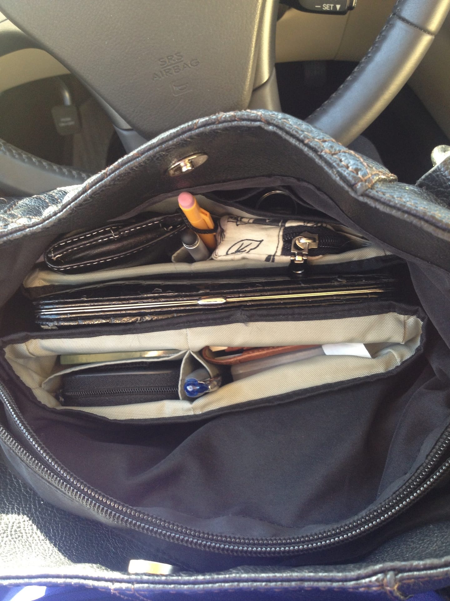 I can easily see the contents of my purse and grab a pen or pull my wallet out in a nano-second. Even my wallet has sections and pockets, which allow me to follow this same approach inside of it. I always know where my headphones are, my business cards, some Kleenex, my office keys and Ibuprofen.