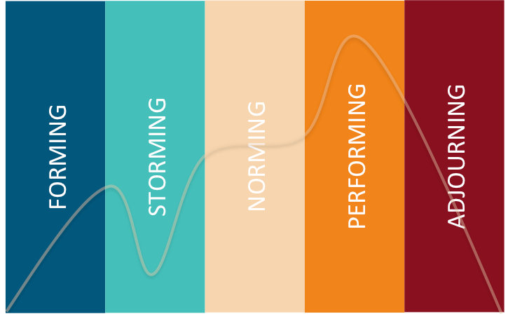 Tuckman and Jensen (1977) describe the stages that a team encounters, as they develop together and tackle a common goal. Drexel University has a wonderful overview of how this process takes shape. The graphic below depicts the stages of team development.