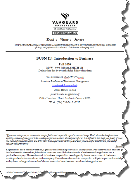 - Leverage technology. Many professors no longer distribute their syllabi in a hard copy format, but instead post it on the university's course management system or their personal website. This not only saves trees, but allows you to take full advantage of the ability to use links both within a Word document (from one section to an appendix, for example), but also to link outside the document (such as to a collection of links for your class posted to a bookmark sharing tool, such as www.delicious.com). I also use an auto-created table of contents, so the learner can easily navigate to various sections of the syllabus as needed. Consider only distributing your syllabus in PDF format, so it is most likely to remain in its original format and be most widely read by different computers/systems.