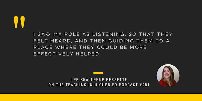 I saw my role as listening, so that they felt heard, and then guiding them to a place where they could be more effectively helped. – Lee Skallerup Bessette