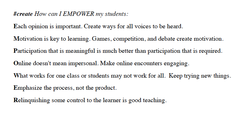 This episode was incredible: I had been grappling with putting an online discussion board into an undergrad course (via Sakai), but simply couldn’t bring myself to do it. The discussion here expressed what my head & heart were in conflict about but also gave me an approach that should solve for the tension I was feeling before I passed that over to my students. Brilliant. Can’t wait to PowerUp as this semester continues!
