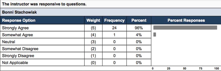 It was nice to see that 100% of the students found that I was responsive to questions, was available for help outside of class, and that I graded assignments in a timely manner.